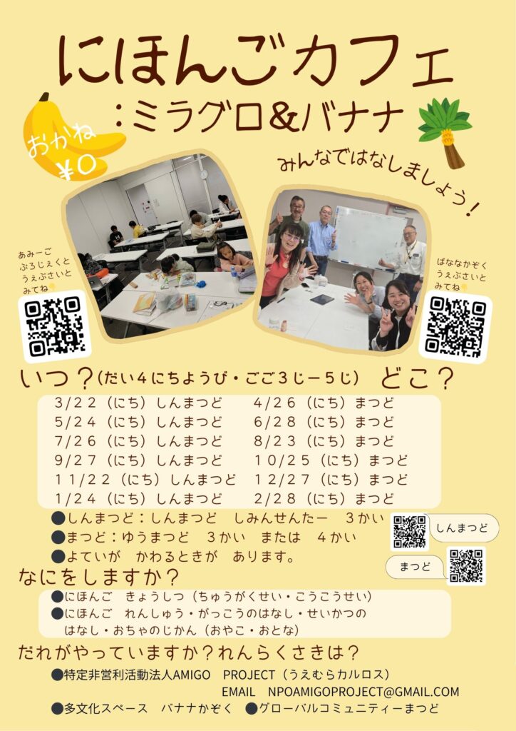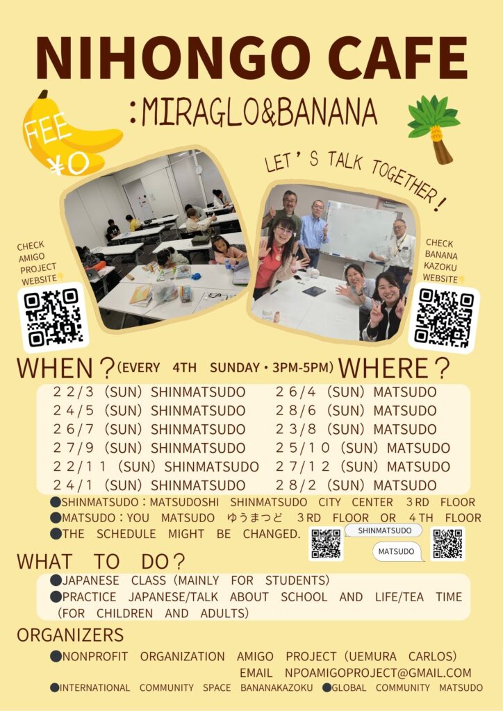 Since 2022 I have been running Banana Kazoku, the international community space and I have thought about starting this kind of place. This time, thanks to the organisation “Global Community Matsudo” in the city, I am planning Nihongo Cafe with them.