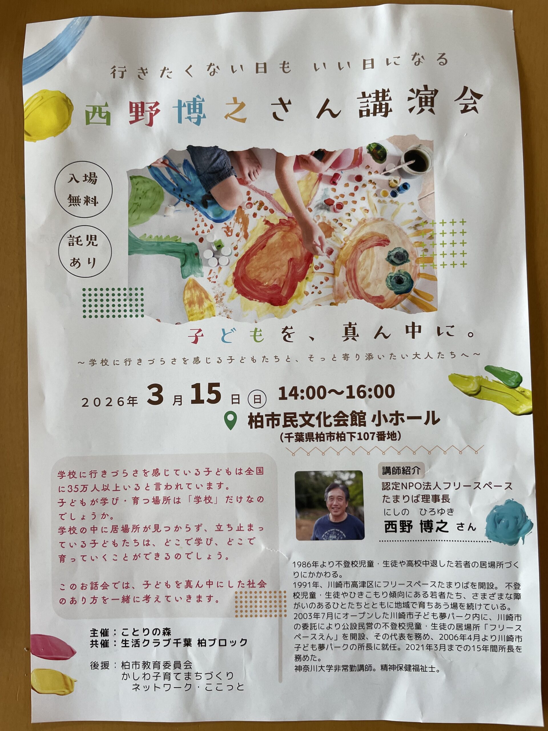 ことりの森さん主催の「行きたくない日もいい日になる 西野博之さん講演会」。