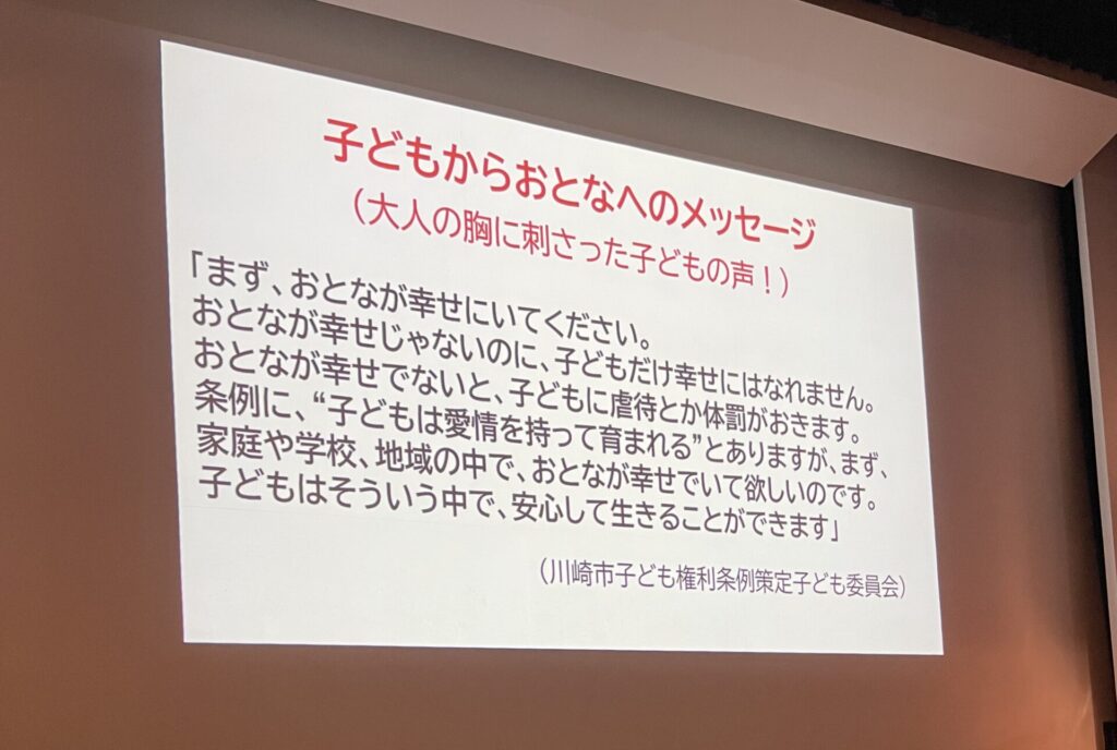 こちらは西野さんのスライドをそのままシェアさせていただきます。川崎市の子ども権利条約のページにもおそらく載っている鮮烈なメッセージです…。